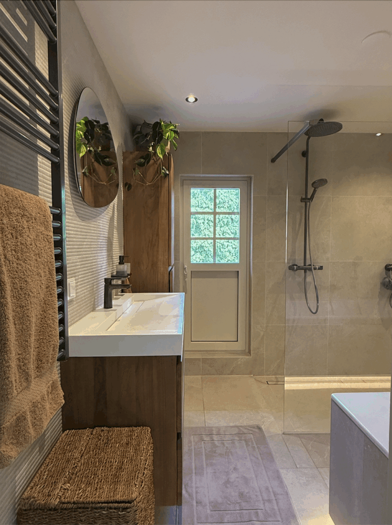 De wens was duidelijk: de stijlvolle uitstraling van hun eerdere opbouw mocht ook in hun nieuwe woning terugkomen. Omdat het huis flink verouderd was, kozen zij voor een grondige renovatie. De begane grond, twee badkamers, drie slaapkamers en de was-/ werkkamer — elke ruimte kreeg een doordacht ontwerp en een frisse, eigentijdse uitstraling, met respect voor het authentieke karakter van de woning.