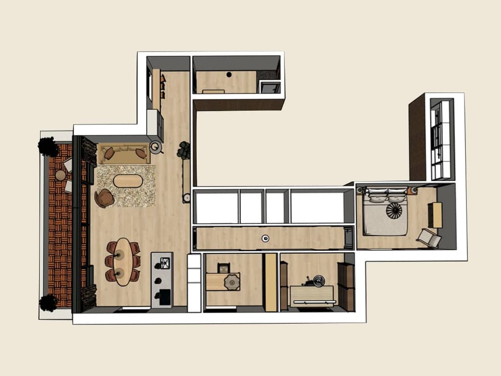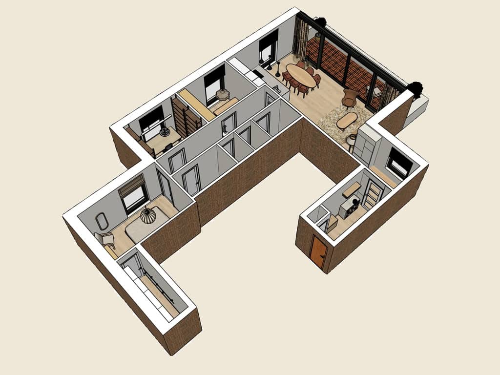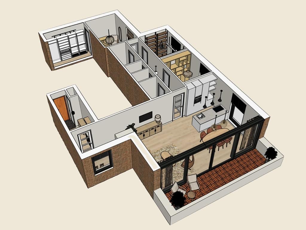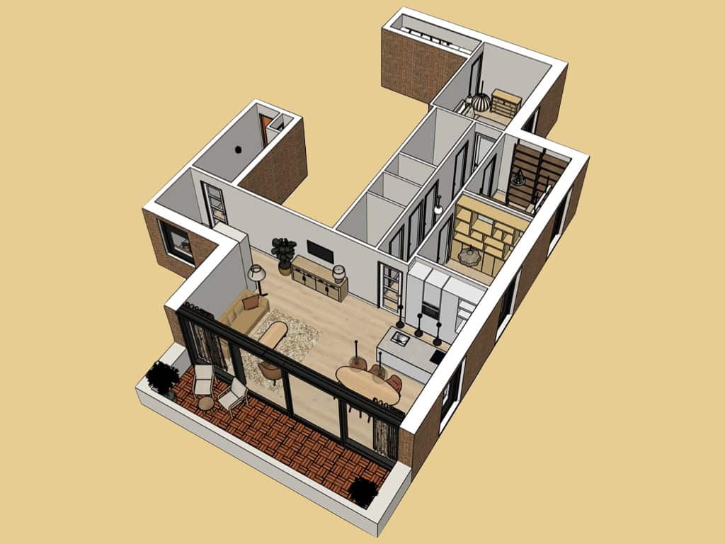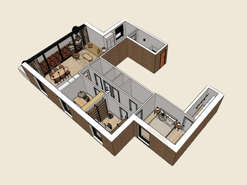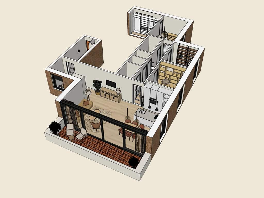Met een 3D-tekening visualiseerde ik het volledige interieur, waardoor de bewoners een helder beeld kregen van het toekomstige eindresultaat.