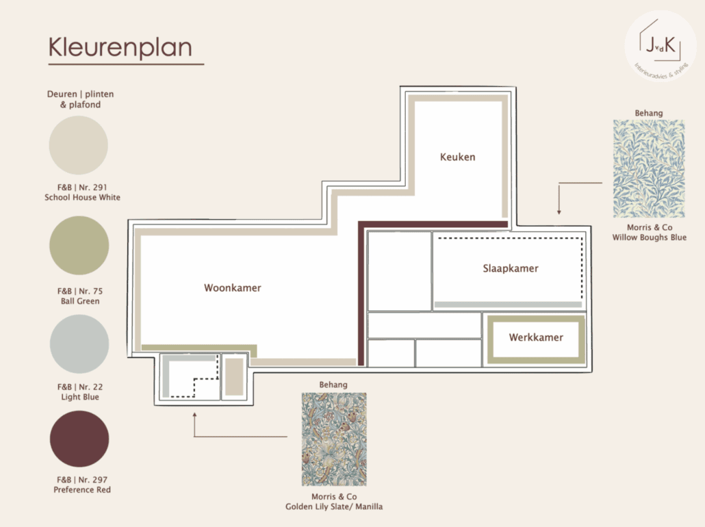 Samen met de bewoners en hun schoondochter ben ik aan de slag gegaan met een kleur- en behangplan, raambekleding en het ontwerp van de keuken, badkamer en het toilet.